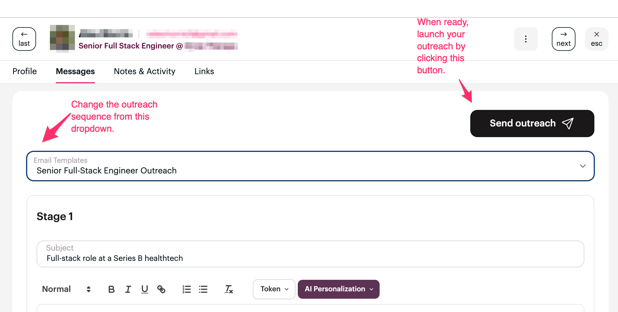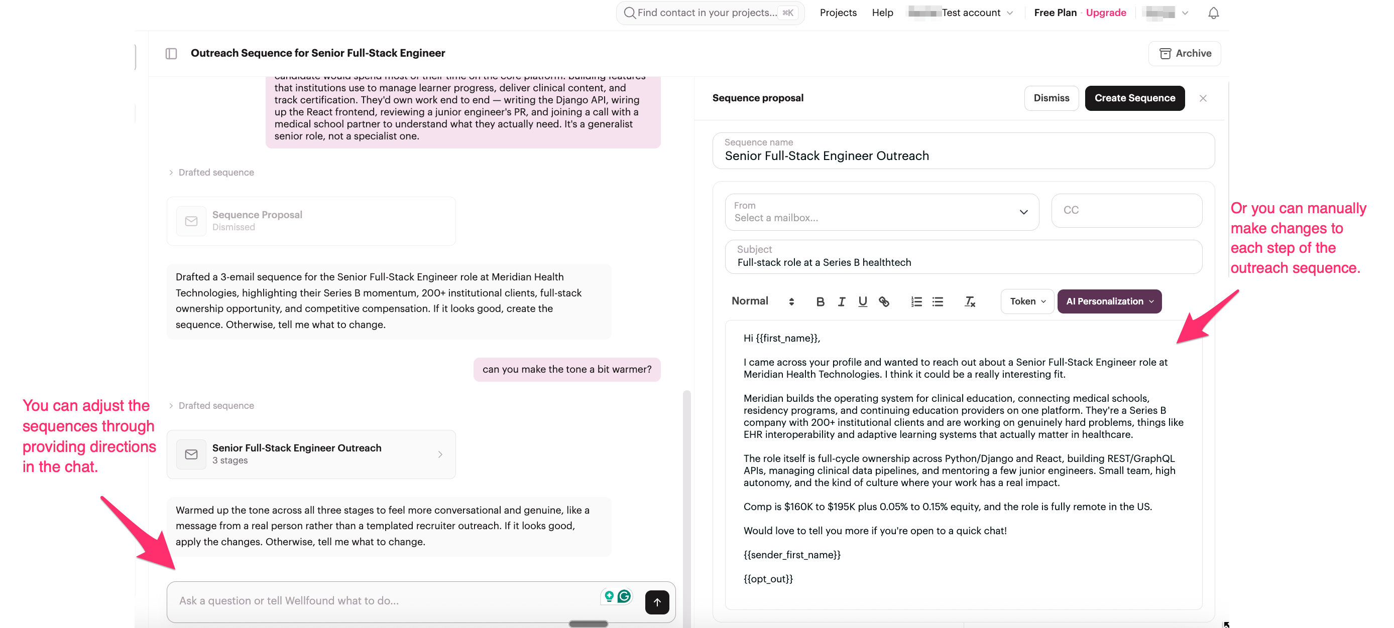 - Choose 'Start with AI help' for faster Outreach Sequence setup. Our AI provides a written framework, suggesting content and messaging flow. Customize messages and cadence to match your recruiting style without compromising quality.