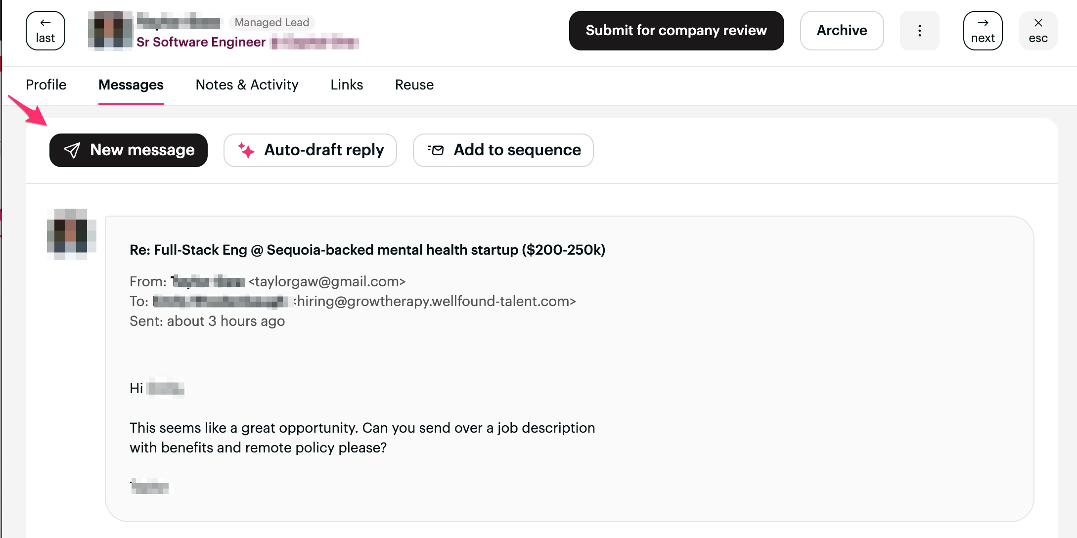 The message will be sent directly to the candidate from the initial outreach account, streamlining communication.