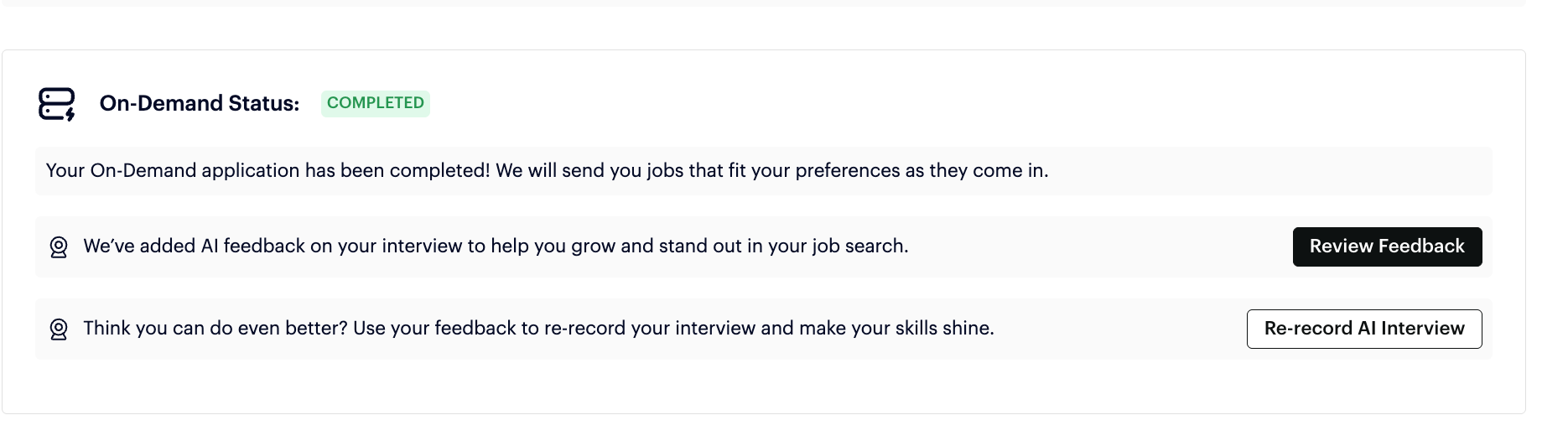 - After the AI interview, you'll see a confirmation that your application is complete. You can review your interview feedback and re-record if you'd like.
