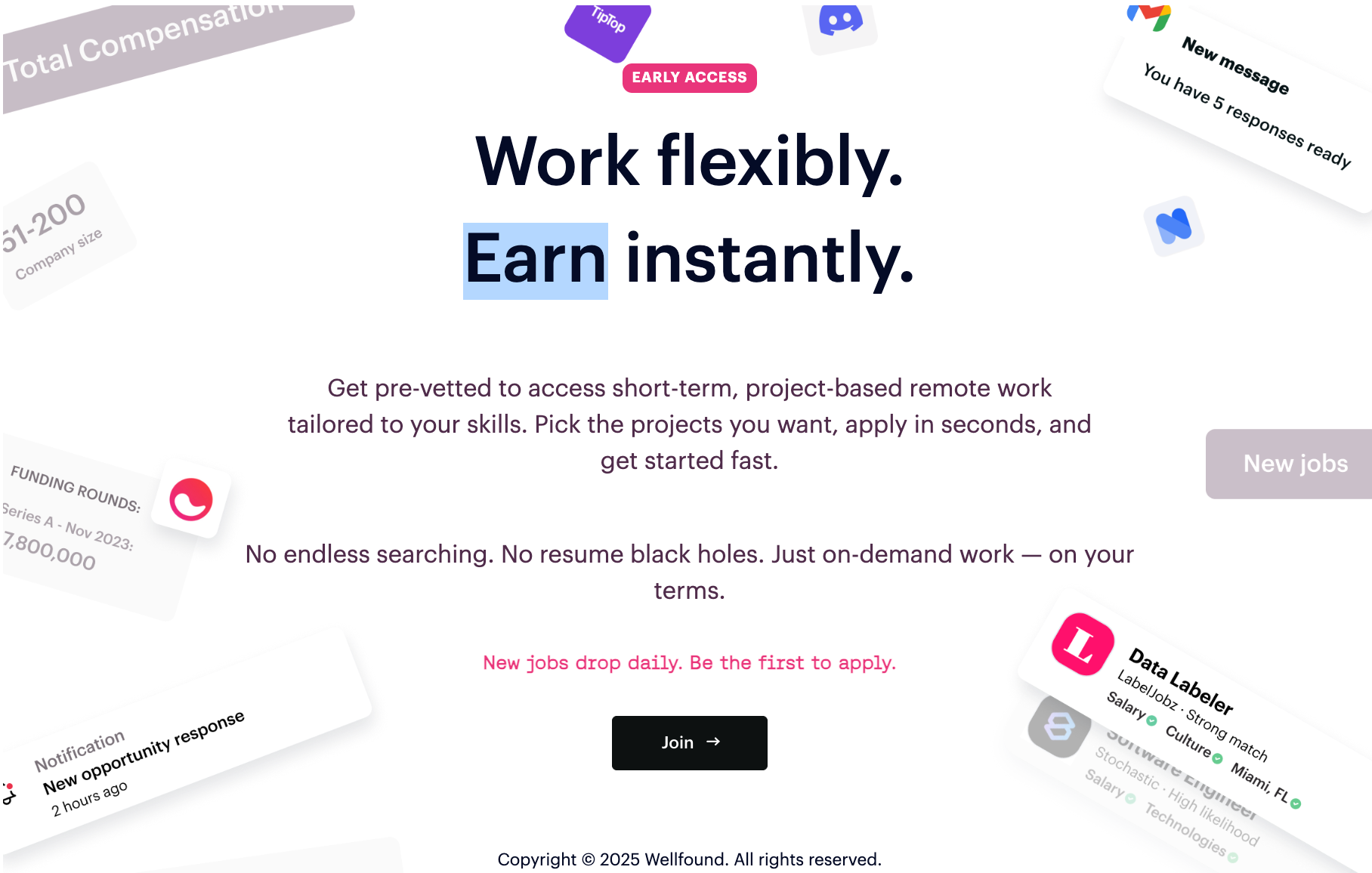 Wellfound On-Demand connects pre-vetted professionals with short-term, project-based remote work. After completing the vetting process, you'll have access to curated project opportunities that match your skills. You can browse available projects, apply quickly to the ones that interest you, and work on your own schedule. Payment is processed promptly upon project completion, and the streamlined application process means you won't need to submit full resumes repeatedly for each opportunity.