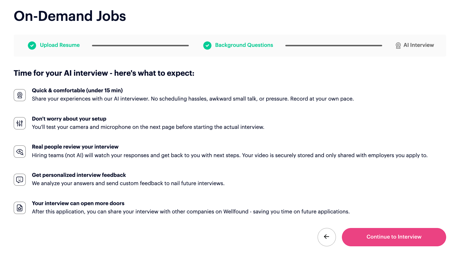 - Participate in an AI interview by clicking 'Continue to Interview'. For help with the AI Interview please click here for more information.
