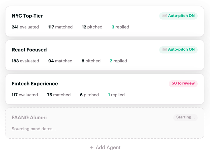- Sourcing agents run continuously — each agent pursues a different search strategy simultaneously (e.g. "React engineers in NYC," "FAANG alumni," "fintech experience"), evaluating candidates and auto-pitching qualified matches from your inbox around the clock.