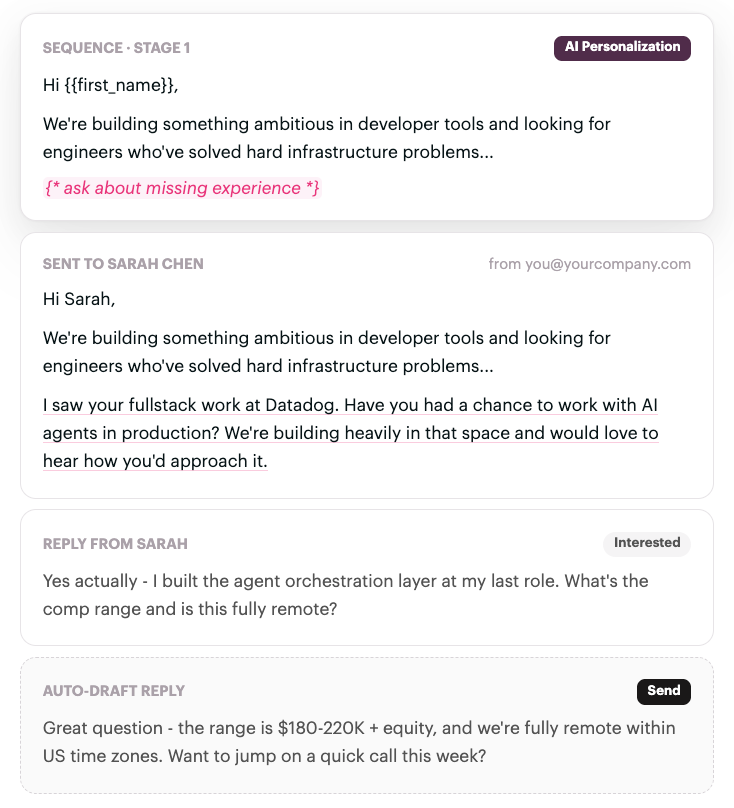 - Outreach from your real inbox — because messages come from your email address, not a platform, candidates see a person, which drives trust and higher reply rates.