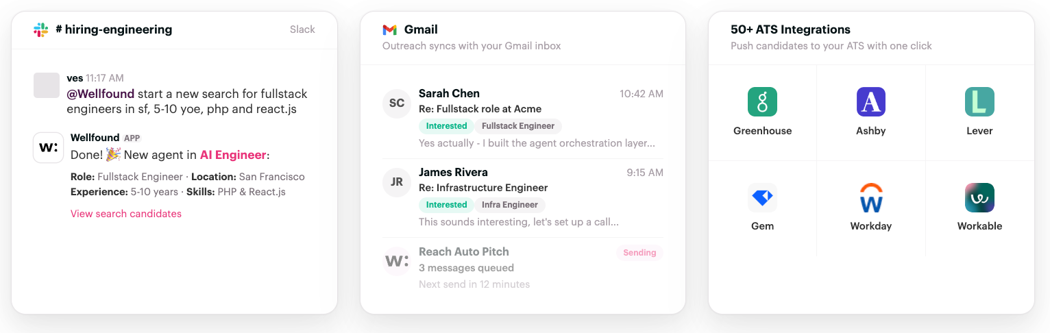 Wellfound Reach connects with the tools recruiting teams already use, including Gmail, Slack, and 50+ ATS platforms, including Greenhouse, Ashby, Lever, GEM, Workday, and Workable.