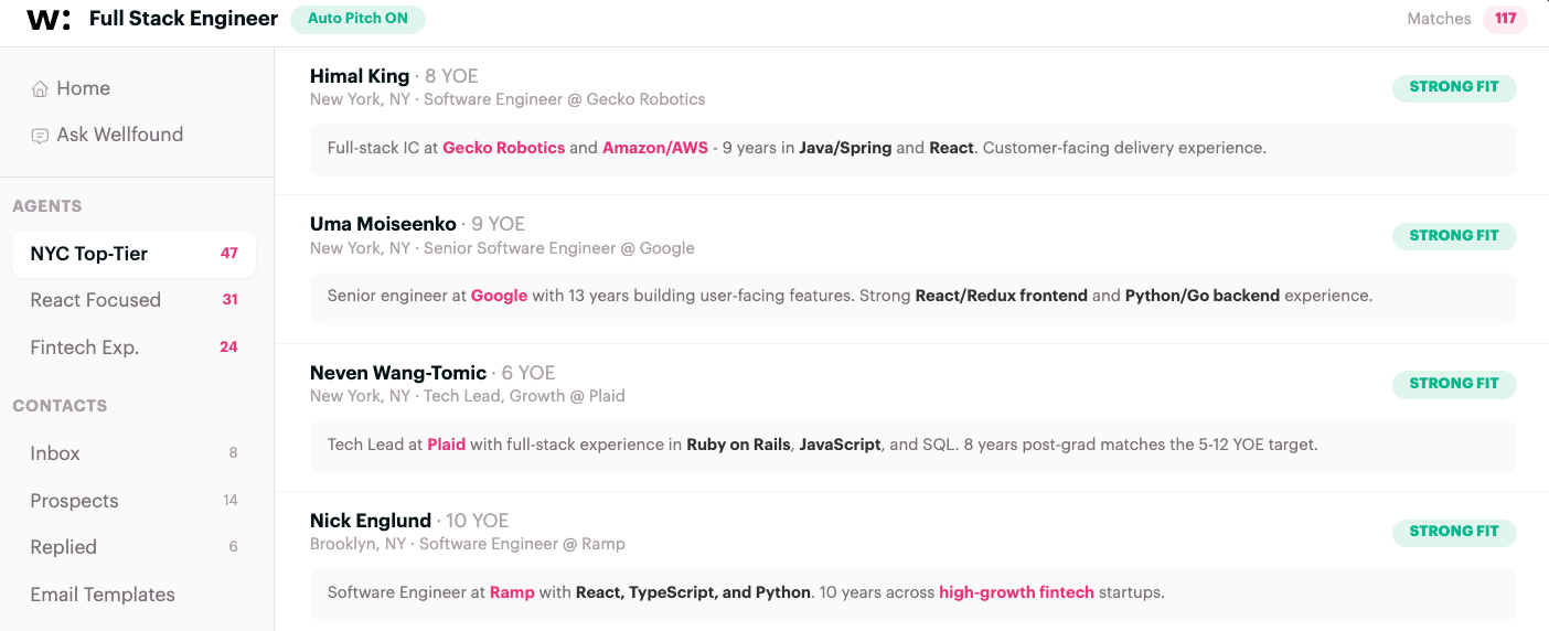 - Agents self-direct when searches stall — the 'Ask Wellfound' tool monitors your pipeline and proactively suggests new angles to try when a current search stops producing results.