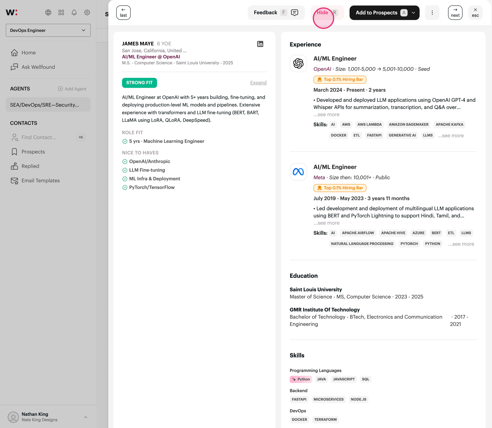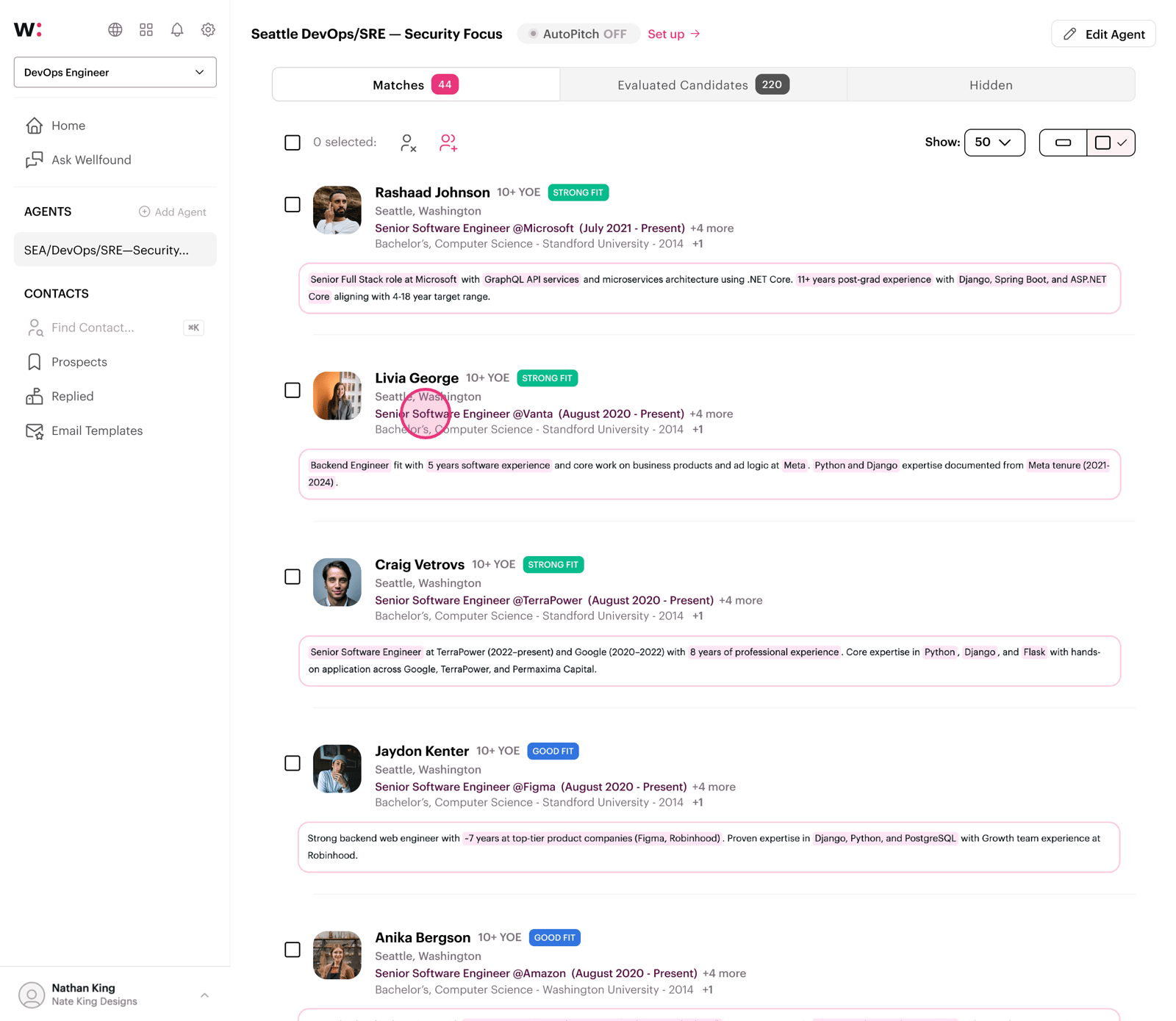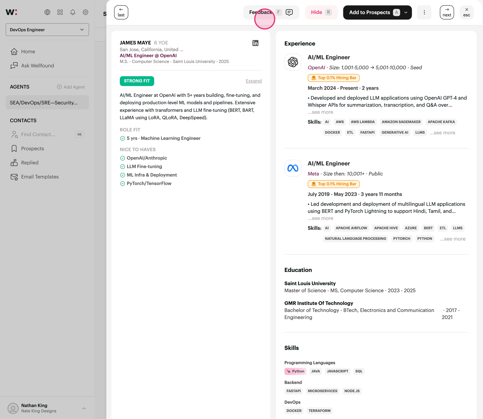 Click 'Feedback' to explain why a candidate isn't a fit — this helps refine your agent's search criteria.