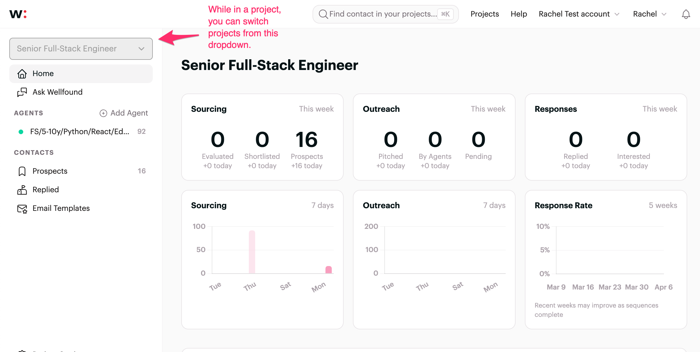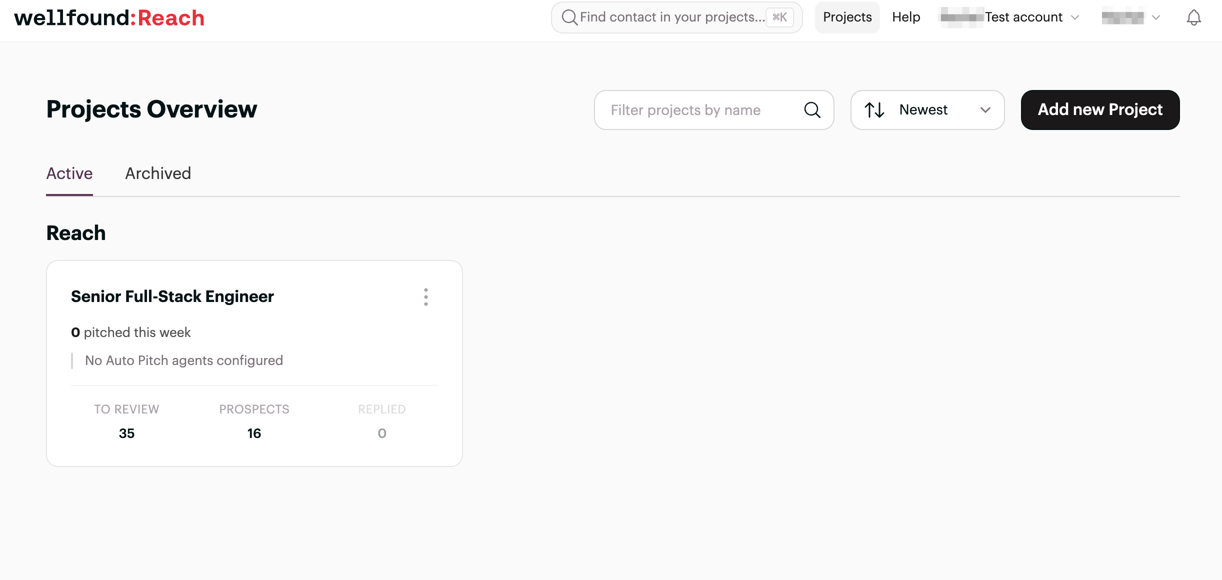 Projects are the foundation of your recruiting workflow in Wellfound Reach. Each project represents a specific role you're trying to fill — think of them as folders that organize all of your sourcing activity for that position in one place.