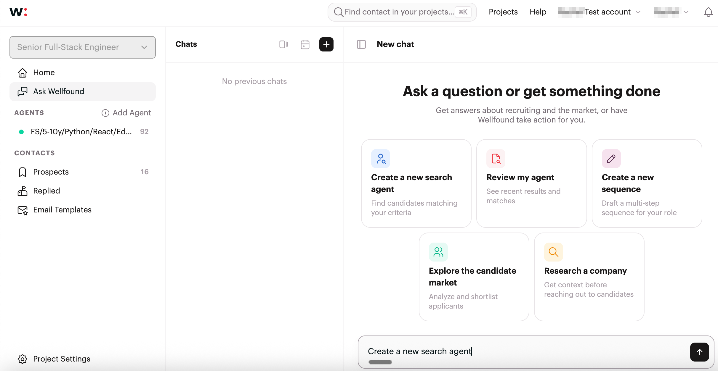 Ask Wellfound is an AI chat tool available within Reach that helps you refine your candidate searches, improve outreach messaging, and assist with other recruiting tasks. You'll find it in the left sidebar of any project.
